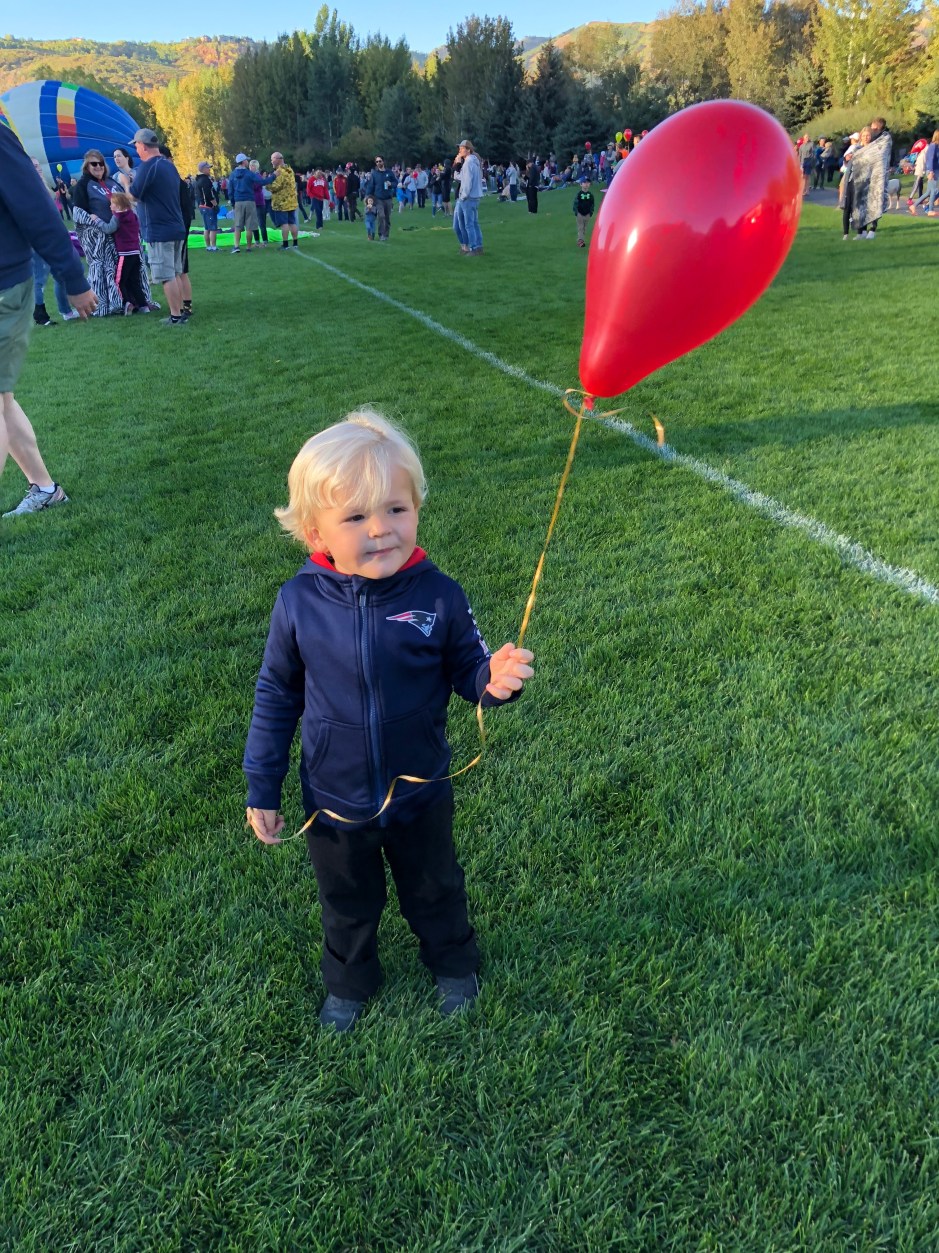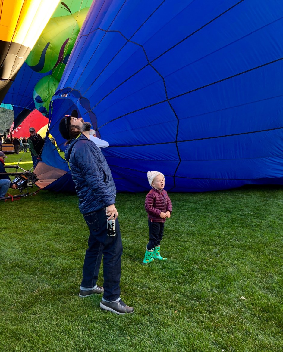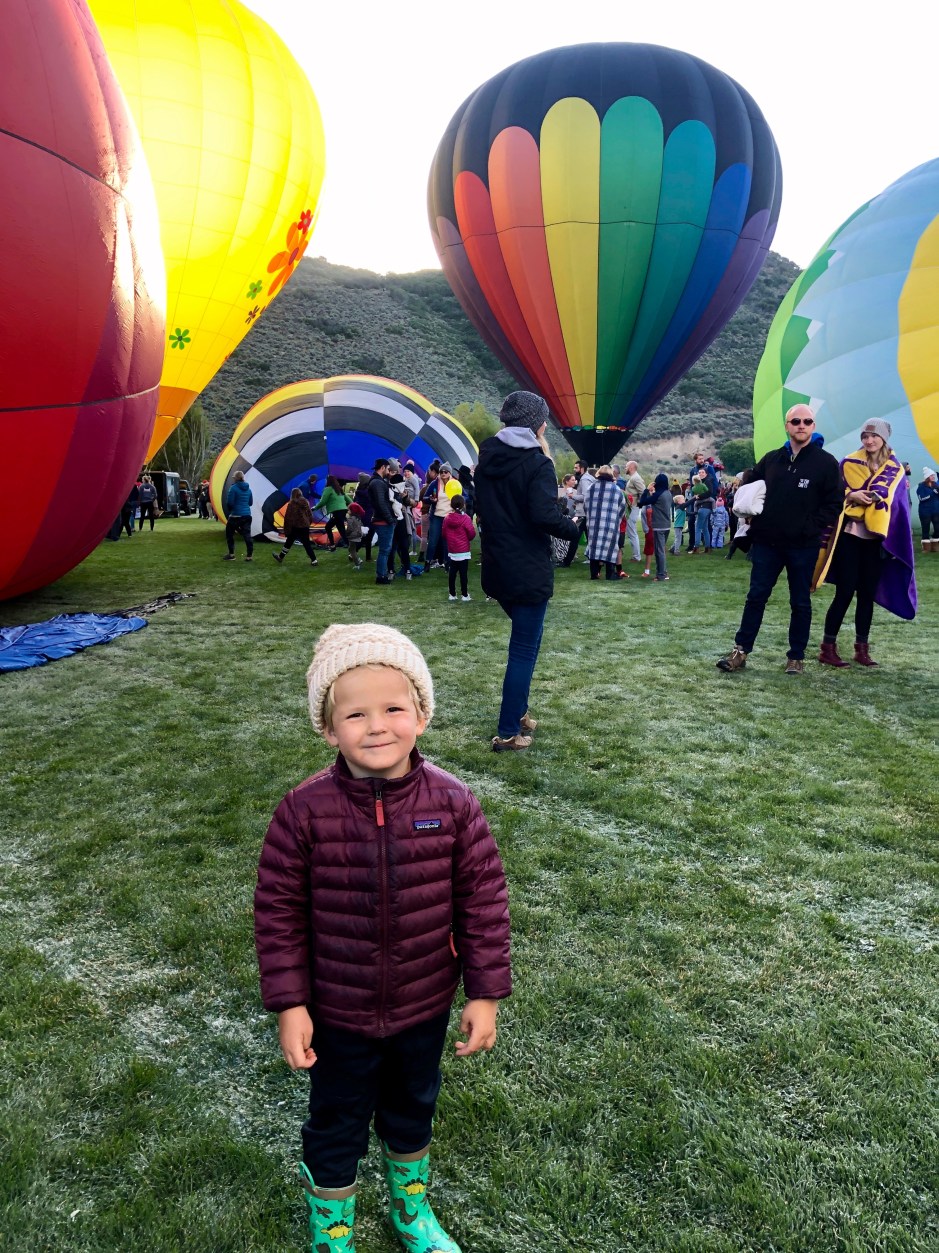 After living in Park City for 7 years, you would think I’d know about the local annual events in town. We don’t miss the 4th of July Parade. We check out the light parade before Christmas. So, last year, when I learned that there is a hot air balloon festival every September right in our new neighborhood, I was excited to add it to our list of reasons we love living here! John was away, so Oden and I (and a Morrison bun baking in my oven) rode bikes over to the nearby fields early one Saturday to witness the magic. Unfortunately, the wind had grounded any balloon flights for the weekend. We watched them inflate but none left the ground. My then-two-year-old was still enthralled, as was I, and we decided to try again next year. Look how cute he was.