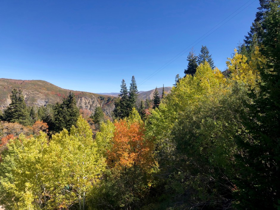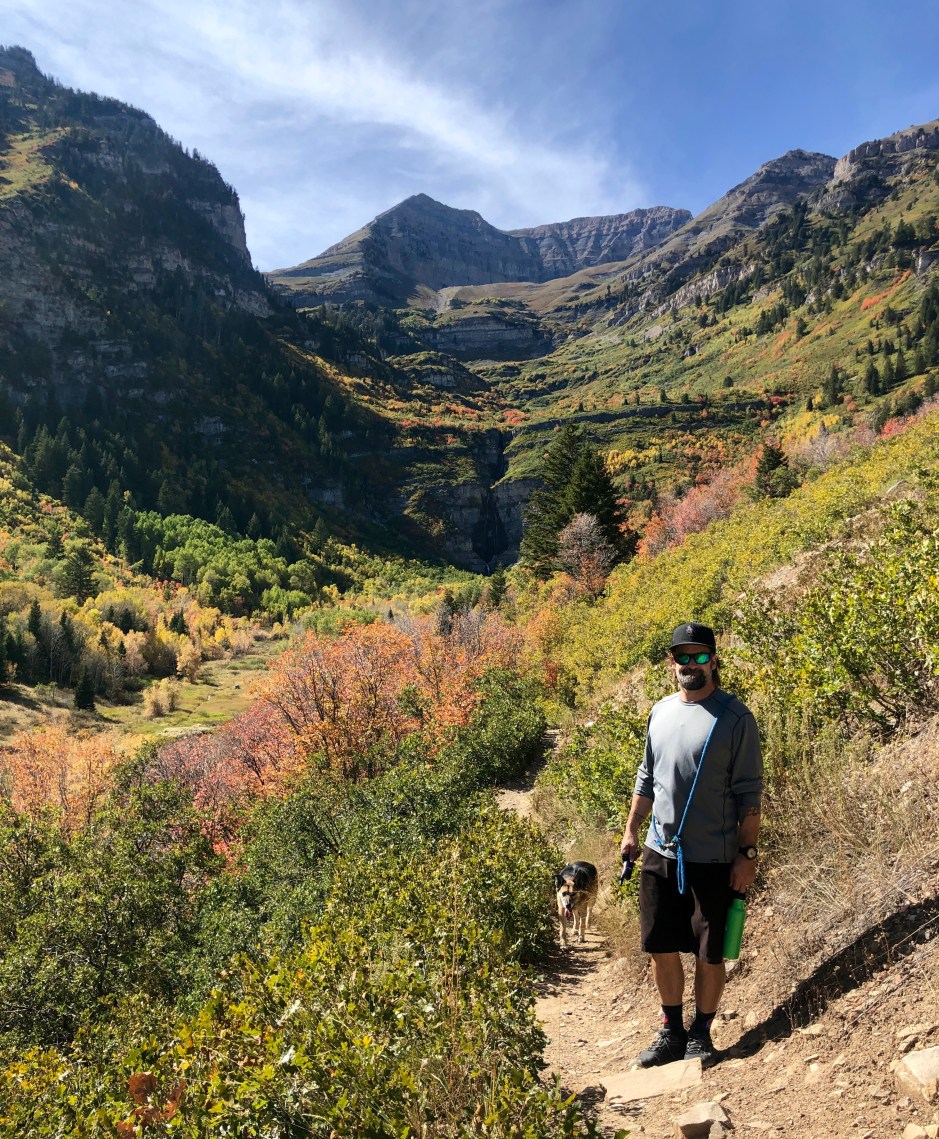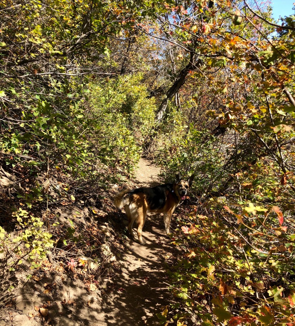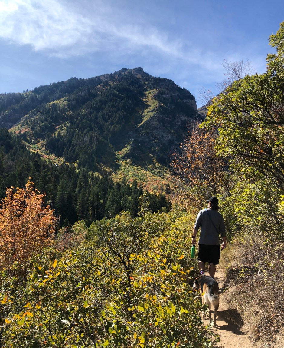 Our main goal for the day was to take a hike toward Stewart Falls. The fall colors were amazing, and Cholula was overjoyed to be sniffing left and right. We hiked as far as we could before needing to turn around to make our spa appointments. There was no way we were going to be late for that. Priorities!