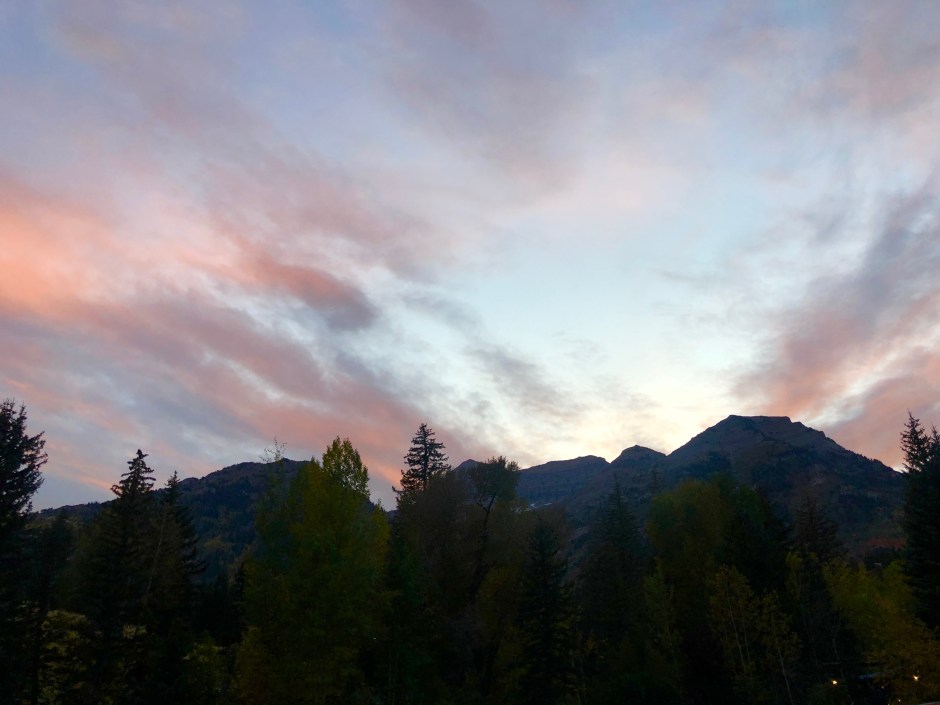 After our soak, checking in with the nanny, and settling in, John and I headed down the hill to Sundance for dinner at the Owl Bar. What a place this is! So much character. A fire was blazing, baseball games were on, and the place was packed. We luckily snagged a table for two and dove right into some burgers. We watched a band starting to set up, but instead of staying to listen, we went back to our cozy hideaway to watch Netflix by the fire. I’m not sure I can remember a more comfortable bed, complete with fleece sheets, and I read my book for approximately 2.9 seconds before drifting off to sleep. And the only thing that woke us up was a gaggle of turkeys cruising by!