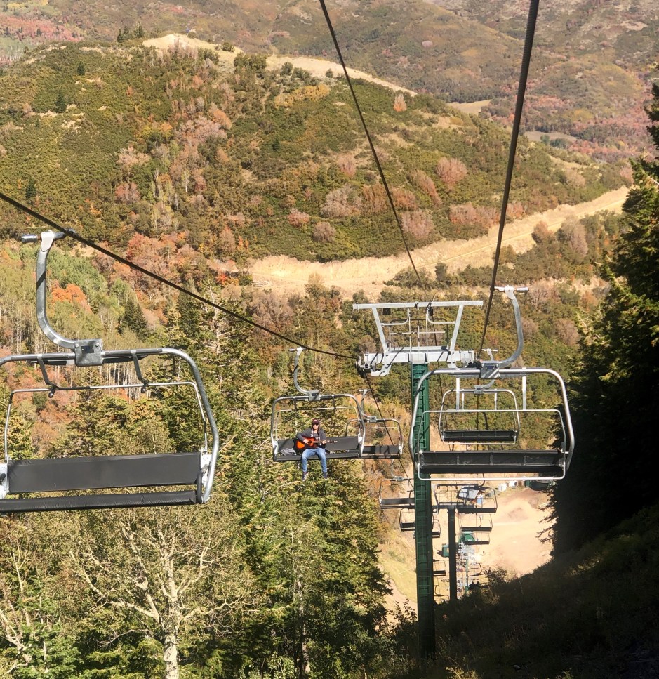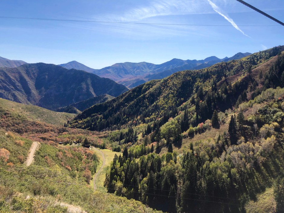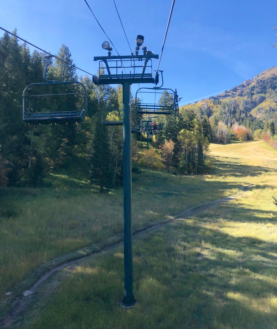 After breakfast and a spin around Sundance’s lovely gift shop, we spontaneously decided to take a chair lift ride to Bear Claw’s Cabin. It’s at the top of Bishop’s Bowl and is the site of our engagement in January of 2012. It was a chilly ride, but relaxing and fun to reminisce. And the scenery was STUNNING!