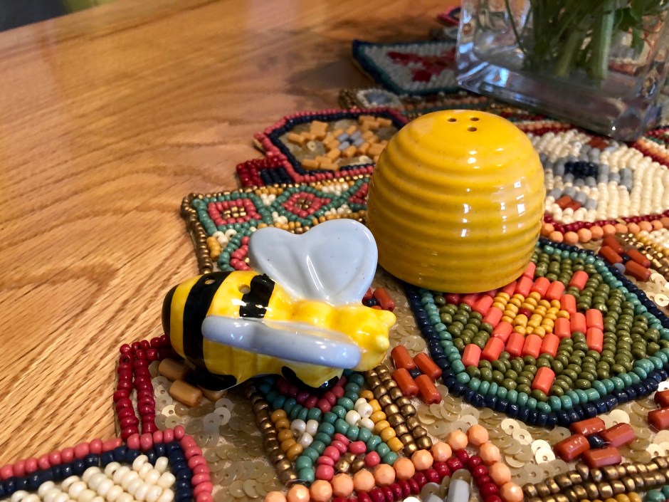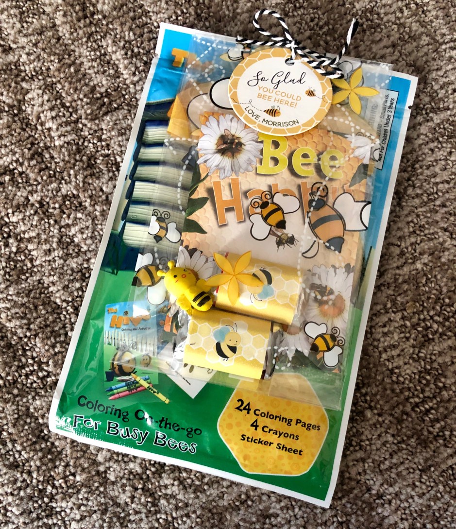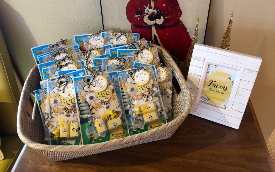 I love throwing parties, and a good theme makes it easy. I knew there would be quite a few kids at the party, so I made little goodie bags for each child to take home. Such a fun thing to do and share! I found little candy bar stickers with bees on them, some wildflower seed packets that said “Bee Happy”, little honeybee erasers, and cute bee-themed mini coloring books with crayons. I tucked the items into a cellophane bag and added a custom tag that said, “So glad you could BEE here! Love, Morrison.” I set them out in a basket where kids could grab one before they went home.