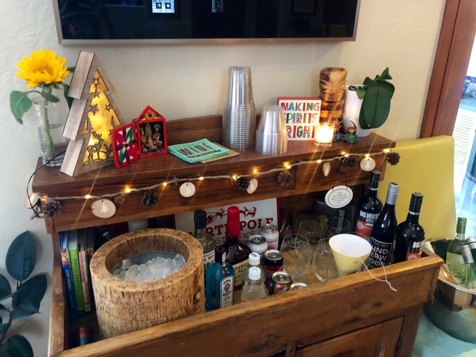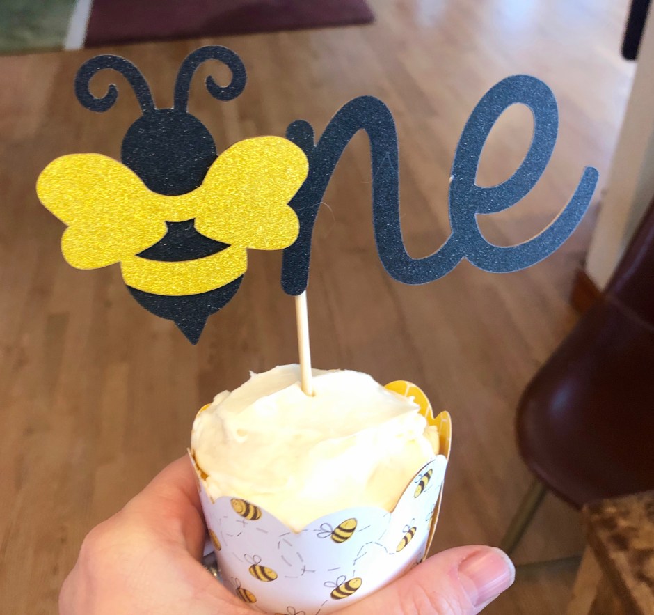 We were so thankful that my parents were able to be in town for the party, and they were a huge help with preparation. So fun! I already have some bee-themed decor for our guest room (Beehive State and all) so we brought them out. We hung a sign on the front porch so everyone knew they were in the right place. I found adorable banners on Etsy and cute cupcake toppers on Amazon. Amazon also had string lights with honeybees, which got hung by the bar and used on the food table for some twinkle. I picked up lots of sunflowers to add to the yellow and black color scheme, which made it feel bright and cheery for early December. My favorite detail was the high chair decoration with a big “1” on it!