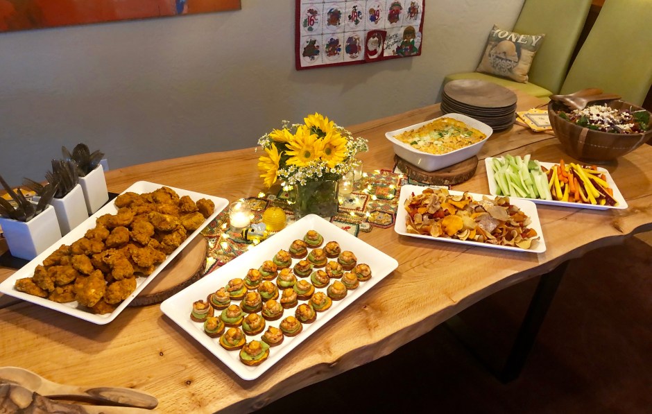 Guys, I used to make all of the food for my parties, no matter the size. I still like to do that, but for this one, I gave myself the gift of having my friend Alisha of Mountain Meals cater the shindig. Such a good call- she makes healthy, amazing food and it freed me up to bake/decorate cupcakes, decorate the house, and spend time with friends/family. She made a tasty spread of appetizers that included a buffalo chicken dip with root veggie chips and crudité, sweet potato/avocado shrimp bites, almond flour popcorn chicken, and a killer salad. Oh! And little donut hole protein bites we put by the cupcakes! YUM.