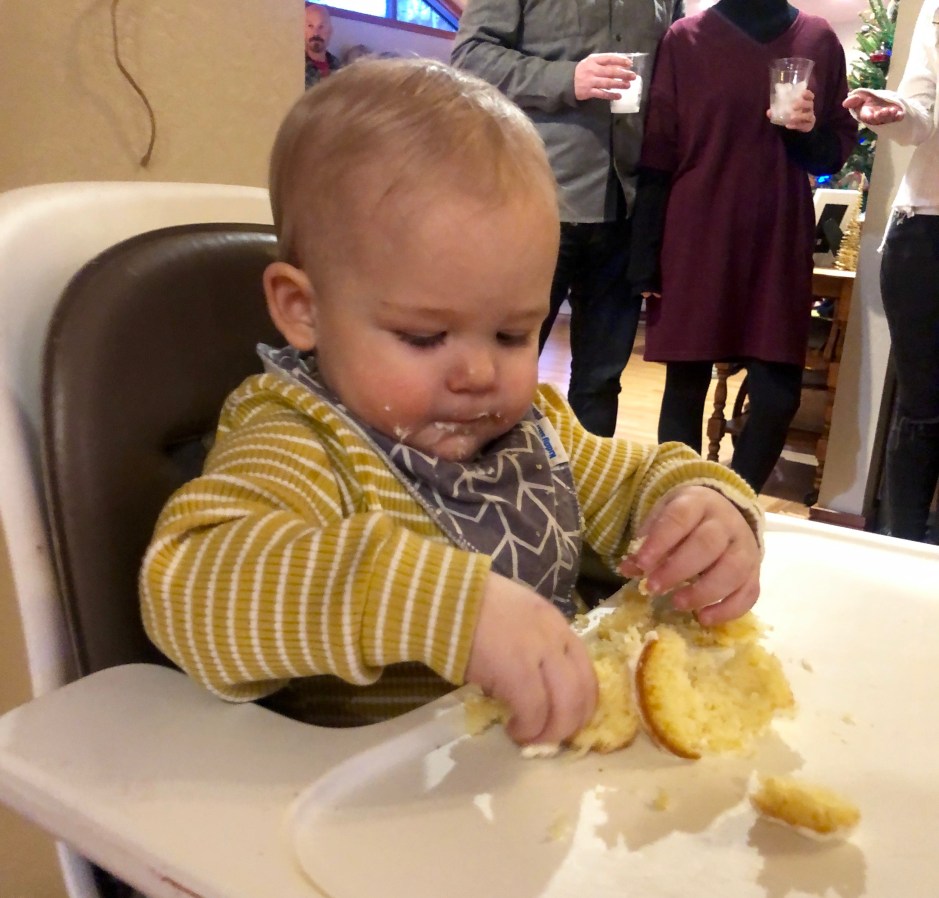 Once people started arriving, it went from zero to 100 pretty quickly. The pile of coats and winter shoes by the door was huge. The LOUD meter went up by a lot. The basket of warm hats and gloves I put by the back door for kids to play outside was ignored, as was the “Pin the Carrot on the Snowman” game. Instead, music got turned up, parents chatted and munched, and shrieking, joyful kids sprinted from room to room and played Superman on the big couch cushions. My dad said that at one point, he came downstairs and saw Morrison alone in the middle of the party, completely unphased by the chaos and smiling. I think my folks were a little surprised at what this little birthday gathering turned into! We all sang Happy Birthday to Mo Byrd and watched him slowly get into a cupcake, squealing as he smeared frosting in his hair. Precious moments. In a moment of brilliance, I put The Grinch on TV and the kiddos settled in with a movie while the adults poured another drink.