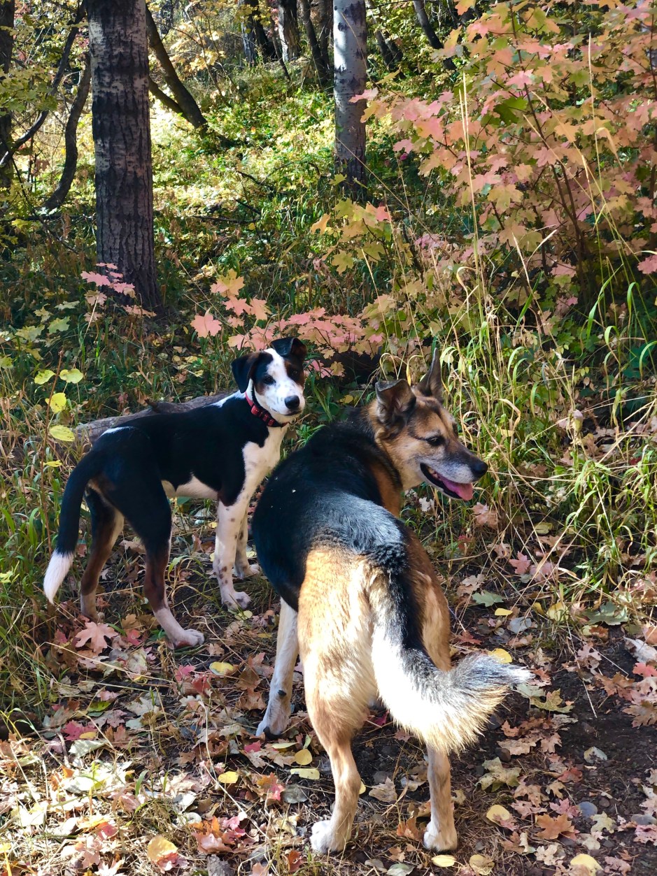 One thing that detracts from the tranquility of a mountain hike? Wrangling a couple of dogs who are still getting used to each other! Quincy is 5 months old and not quite sure about…well, anything just yet. Cholula is almost 9 years old and still somewhat miffed that we brought not one but TWO tiny humans home, so the floppy mutt-baby trying to steal her seat in the Subaru is confusing. But it does seem like they are starting to be buddies. If seeing one wagging tail brought me joy before, seeing two wagging tails is even better!