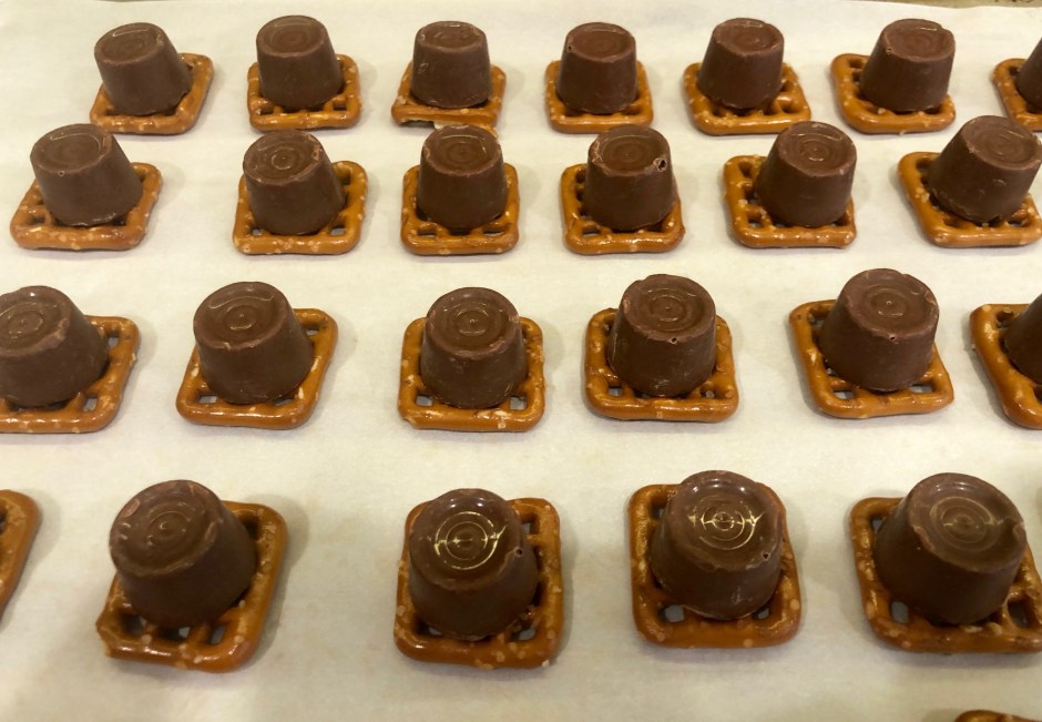 First, can we talk about these Caramel Pretzel Bites? Crunchy, salty, sweet, super cute, and simple. They are so tasty! To make them, I simply placed the pretzels on a baking sheet lined with parchment paper. I dropped an unwrapped Rolo candy on each one, then warmed the pan in a low-heat oven (200 degrees). After about 7 minutes, when the Rolos were soft, I pressed another pretzel on top to make a gooey, chocolatey, caramely sandwich. YUM.