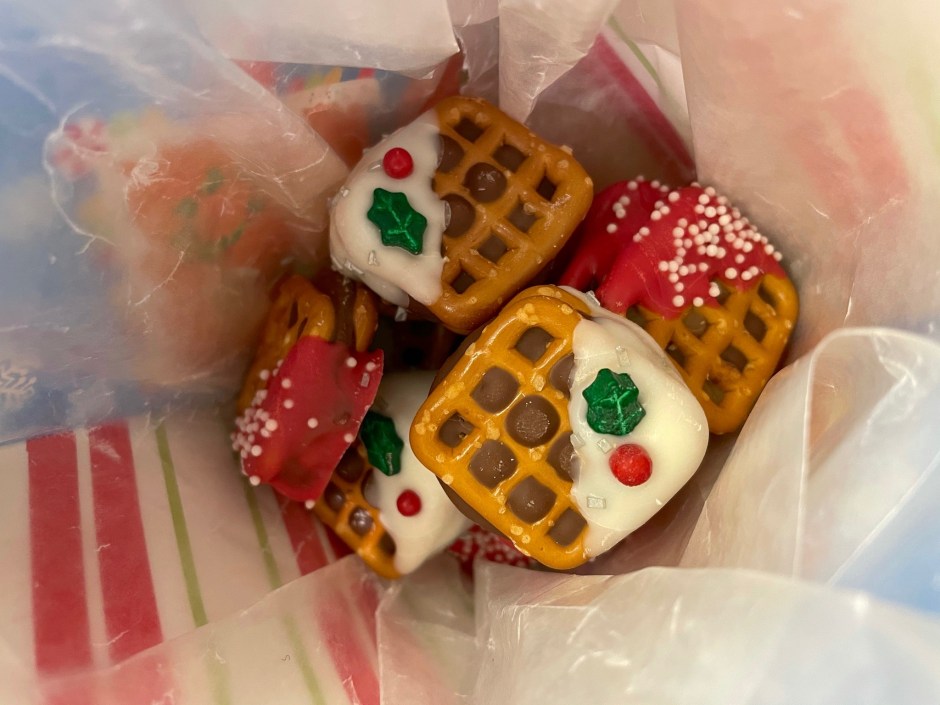 After the candy cooled and firmed up, I dipped each one in melted colored chocolate and added some holiday flair. I let them cool again before packing them up to share. A few may or may not have found their way into my mouth. We’ll call it quality control. YUM! The hardest part about making these treats was peeling the foil off of the Rolo candies. Delicious doesn’t have to be difficult, and a homemade gift is always appreciated! My neighbors loved them. These would be fun for any party or gathering throughout the year.