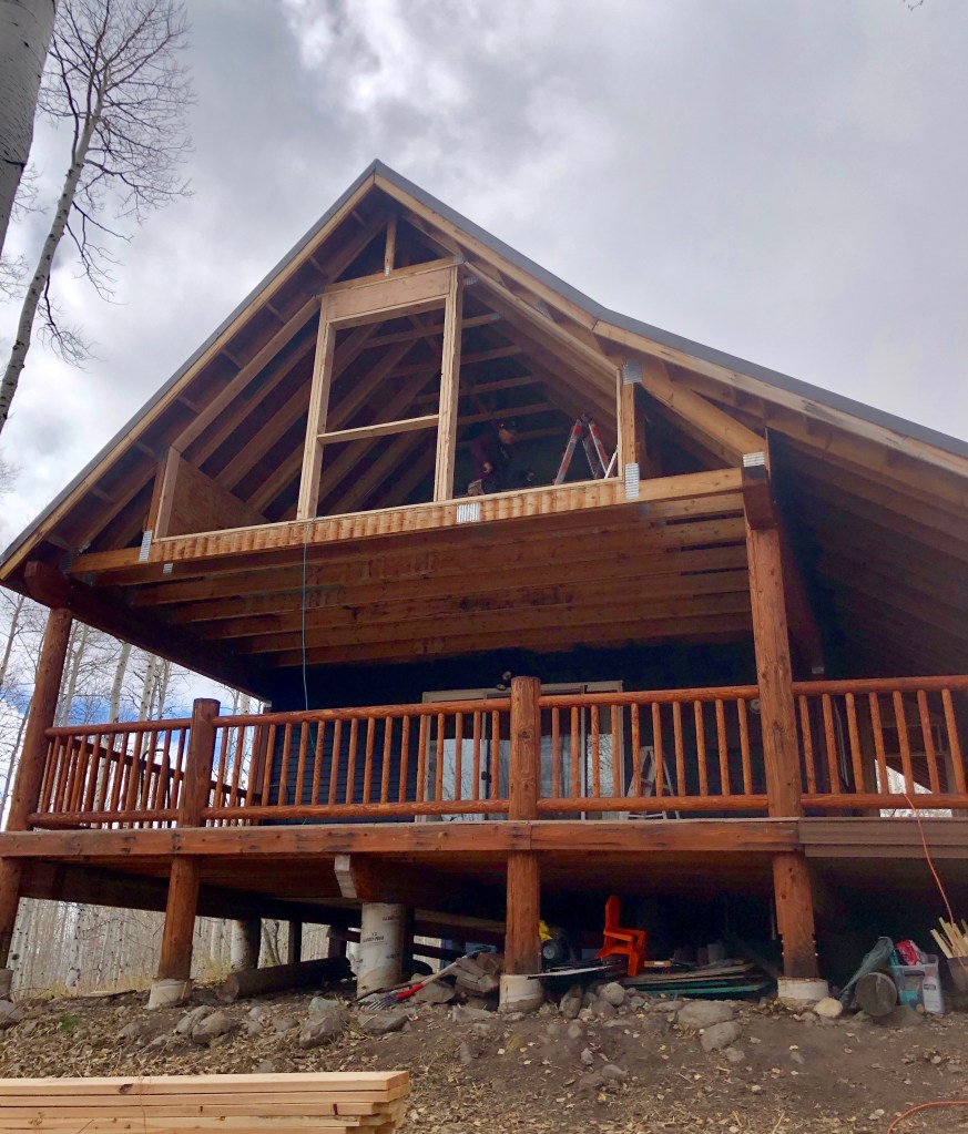 The challenge now would be to get the work done before the property was buried in many feet of snow! At 8,500 feet, winter starts early and the gate would close for the season. The first snow happened at the end of October. The first snow that stuck around came in mid-November. We visited the cabin often to check on the progress. John also spent a ton of time chopping wood from the property to use through the winter. Thankfully, our contractors were willing to keep working to finish the job before Christmas. They used our owner’s key to access the gate, and would ride snowmobiles to the cabin to work. Mountain living!