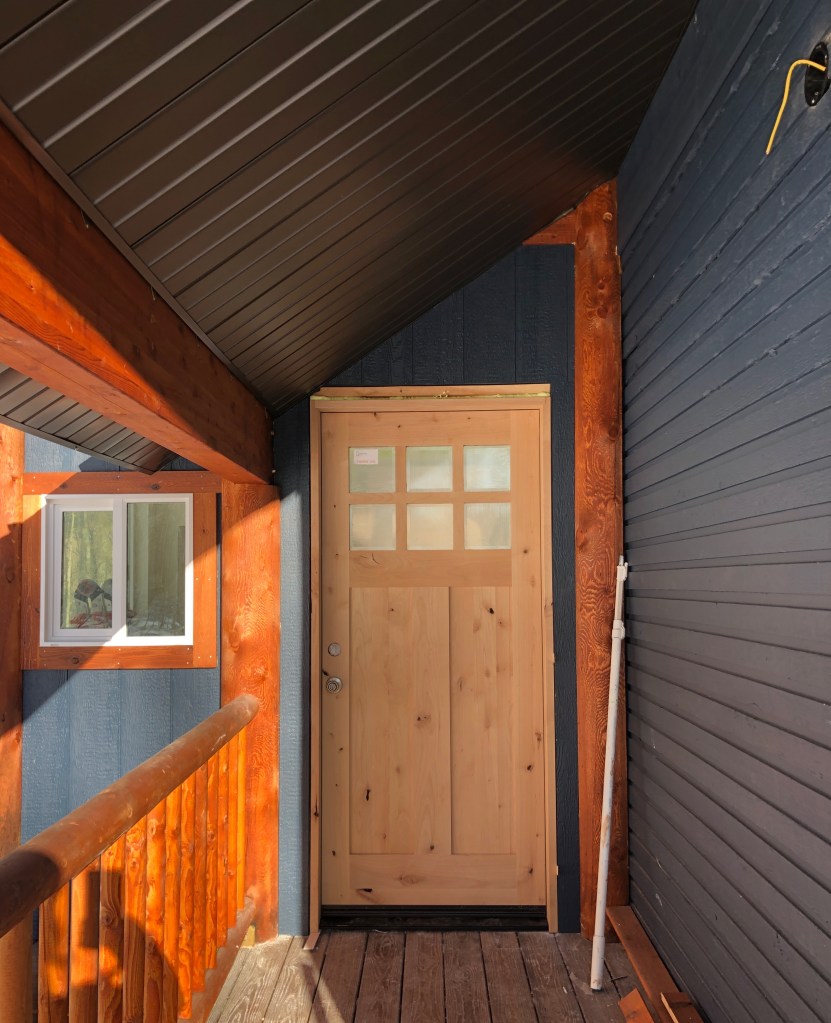 It wasn’t until October that we started a true renovation. Some of the external siding needed replacing and the paint was a mess. So we took the opportunity to choose a different color for the cabin- the same color of a lovely A-frame we’d visited. We also sanded and stained the wood/log trim. I was a little worried that the dark blue we selected was too dark, but it ended up being perfect. The old girl cleaned up nicely!