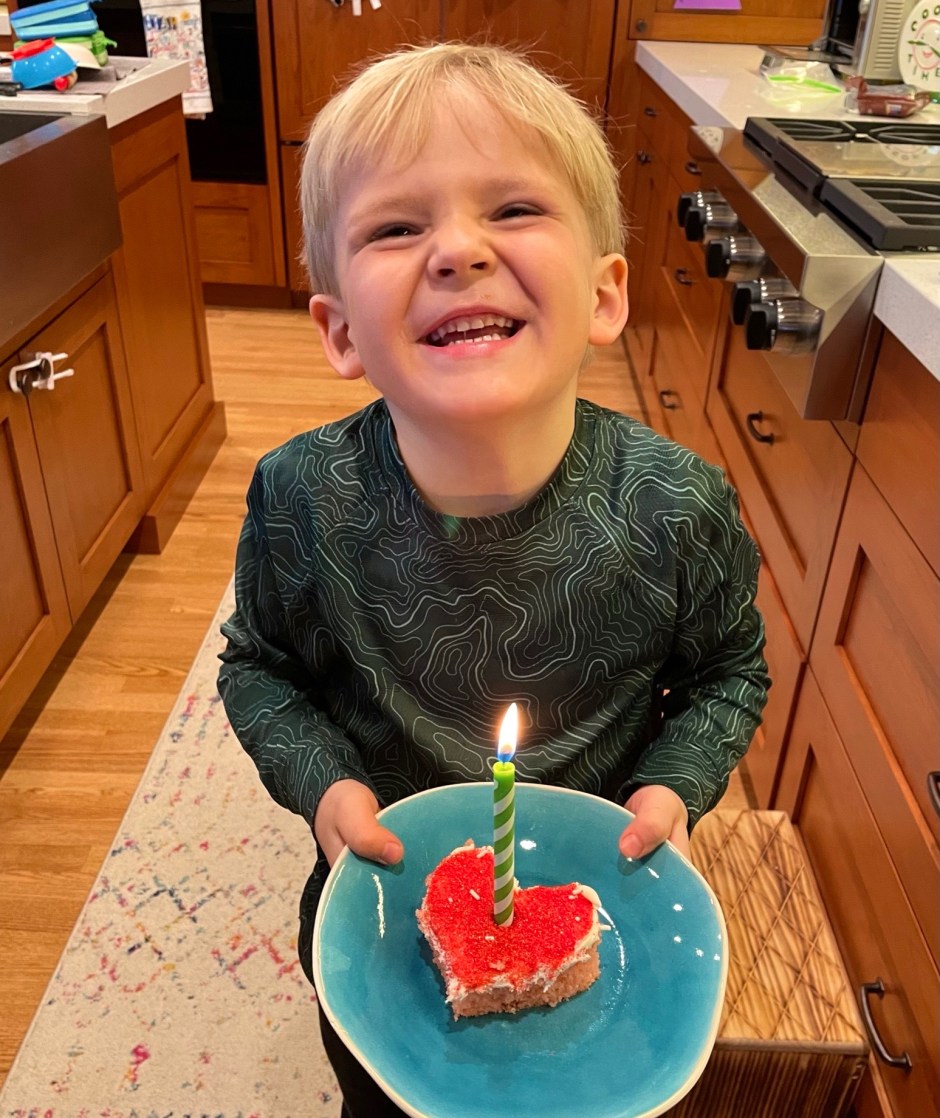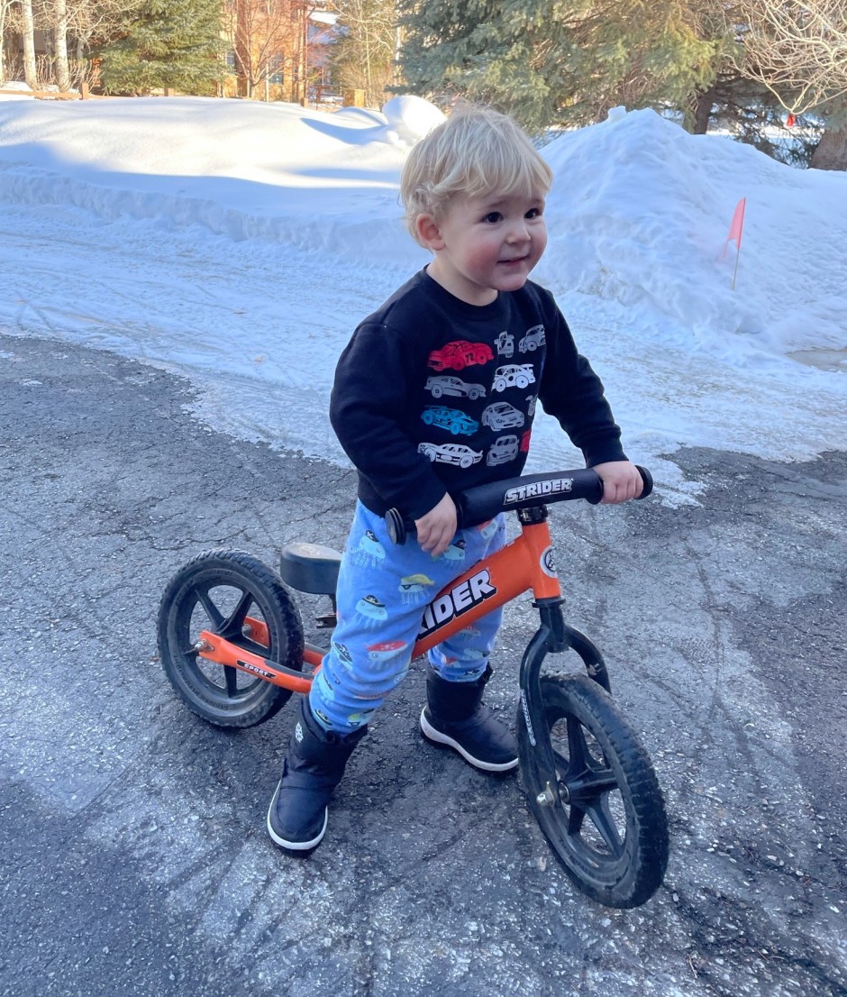 On the eve of the big day, Mama stayed up late making sure some birthday traditions were ready when Oden woke up. There were balloons on streamers, a DIY crown to decorate, gifts from Uma and Papa, and vanilla sprinkle pancakes. Yum! He received more gifts from our sweet nanny and had some snow-filled adventures with Mo. Before blowing out candles on his cute little cake, he discovered his “big” present from us: a new bike! The kid keeps outgrowing his bikes, and this one has gears. Mo was pretty excited to copy Big Bro on the hand-me-down Strider.