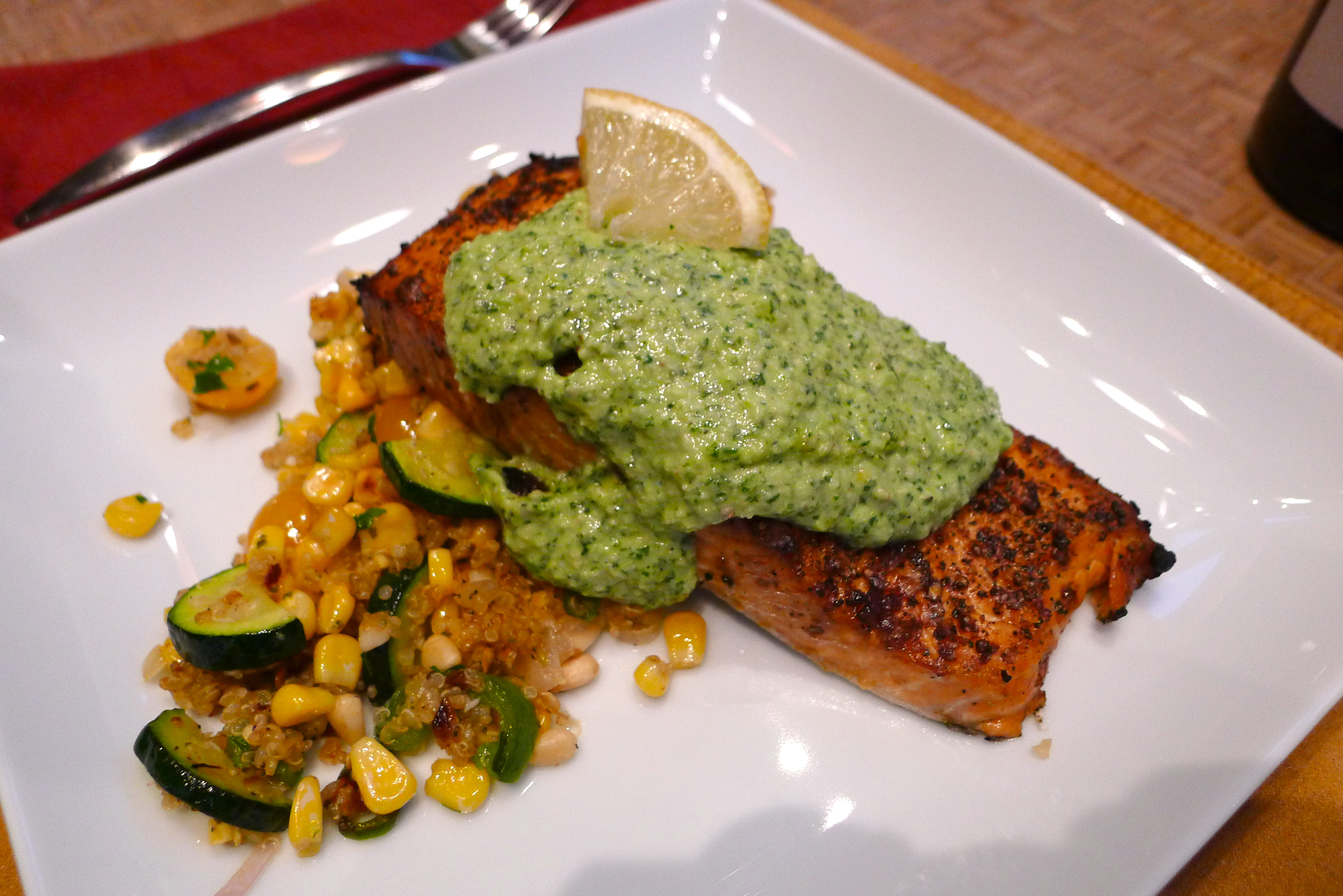 20. Cedar Plank Grilled Salmon with Spicy Lemon-Herb Pesto